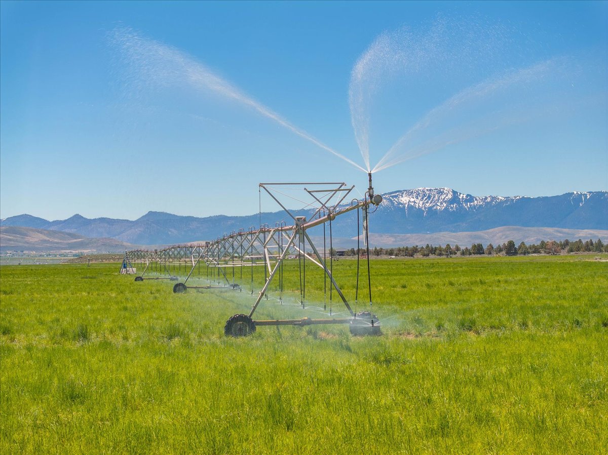 11 PARCEL NUMBERS: 101-080-015, 101-130-016, 101-130-017, 101-130-030, 109-060-018, 109-100-024, 109-100-025, 109-100-026, 109-100-049, 109-100-050, 109-100-057 FARM GROUND: Approximately 350 acres irrigated 318 acres planted in orchard grass, irrigated with 1 linear and 3 pivots, small wheel line and some hand line to pick up corners. 32 acres will be planted in teff grass for the 2025 season. (The 32 acres can be irrigated by linier and has been in orchard grass). 75 acres in the east field can be dry land farmed and has been planted in winter wheat in the past. Rye grass would also do well. Now leased for spring grazing. This section is fully fenced with a solar powered stock water well. There is an underground line providing water to a small pond. The owner recently drilled a new ag well, hoping to get enough water to irrigate the 75 acres, the well produced 300 GPM which fell short of the owner’s needs. Production average is around 6 ton per acre with 3 cuttings. June – October. AG WELL: The well is located at the north end of the ranch. The 200 HP pump produces 1800 GPM and supplies ample water to the farm ground via underground mainline. CUSTOM HOME: 3087 SF with 4 bedrooms and 2.5 baths. Built in 2004 Very attractive entryway through a beamed archway, passing well-appointed landscaping. The lush green lawn is split by a large concrete walkway, stepping up to the covered wrap around stamped concrete deck. As you enter the custom glass front door, the home opens to a great room, large living area with vaulted ceilings, an office to the left and formal dining with kerosene stove to the right. The kitchen area has a curved barstool counter and breakfast area. 2ft tile floors except in living area. LIVING AREA: Wonderful river rock hearth features fireplace, sitting area and unique log mantel, carpet floor covering and strategically placed floor outlets. KITCHEN: Custom knotty alder cabinets, some with glass face. Curved raised bar counter with farm sink and dishwasher. 6 burner gas range with warming side door, three door refrigerator, all stainless appliances and granite countertops. Small island. Cozy breakfast area with door to back patio. OWNERS SUITE: Great space with kerosene stove on corner river rock hearth. French door to back patio. Large bath with dual sinks, jetted tub and tile shower. Nice walk-in closet. Carpet in bedroom area and tile floor in bath ADDITIONAL 3 BEDROOMS and BATH: The oversized tiled hall splits, right to owner’s suite and left to additional bedrooms and bath. All bedrooms are spacious, one with walk in closet. The hall bath has dual sinks and tile shower over tub. LAUNDRY ROOM: Separate room off kitchen with cabinets and door to garage GAME ROOM: 16X28 game room with 1/2 bath. Equipped with heating and air. Accessed from back patio or garage. 3 CAR GARAGE and CAR PORT: Oversized garage with concrete floors, insulated and sheet rocked walls. Two electric doors. Large concrete apron in front. Single unit car port beside garage with concrete floor. IN ADDITION: