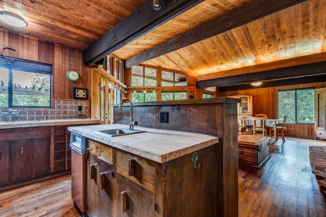 - Interior special features include wood, tile, unique architecture with tall wood-framed windows, custom cabinetry and lighting fixtures, a stone chimney with a brick fireplace