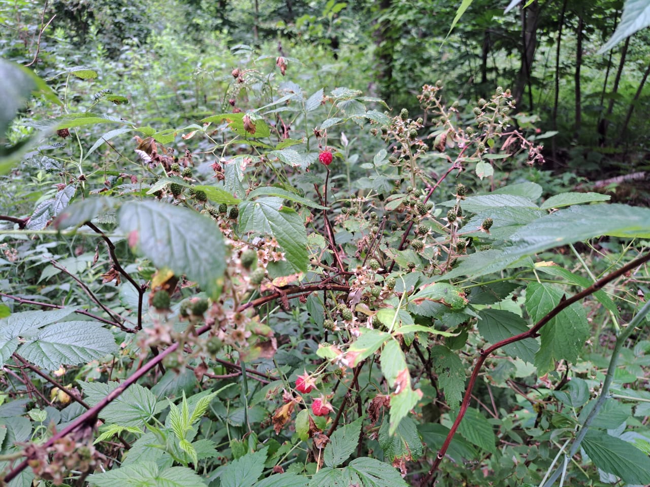 Exploring the property reveals abundant whitetail deer activity, including herd trails through the heavy cover, browsing on the berry bushes, and hoof tracks headed to the stream. Ruffed grouse were recently observed; the cover types meet the specific habitat requirements for this species.